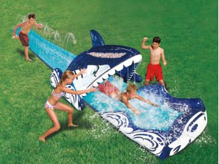 20-feet of water slide helps beat the heat Launch yourself through the inflatable shark-head water tunnel (if you dare)! Then, blast into the splash pool for some wet-n-wild fun! Comes with a repair patch and 2 ground stakes. Easily connects to any hose, how-to s included. Plastic, 50" wide, 35"H.
