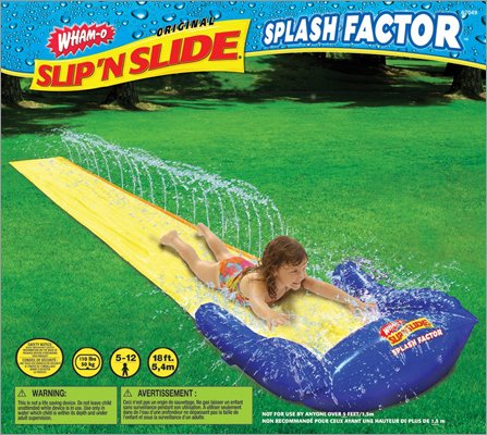 Wham-O -For ages 5-12 years. -16 foot water slide. -New Splash Factor has an extra wave of water at the end. -Slide through the water spray chute to get ultra-soaked then land in the inflatable splash pool. 62049